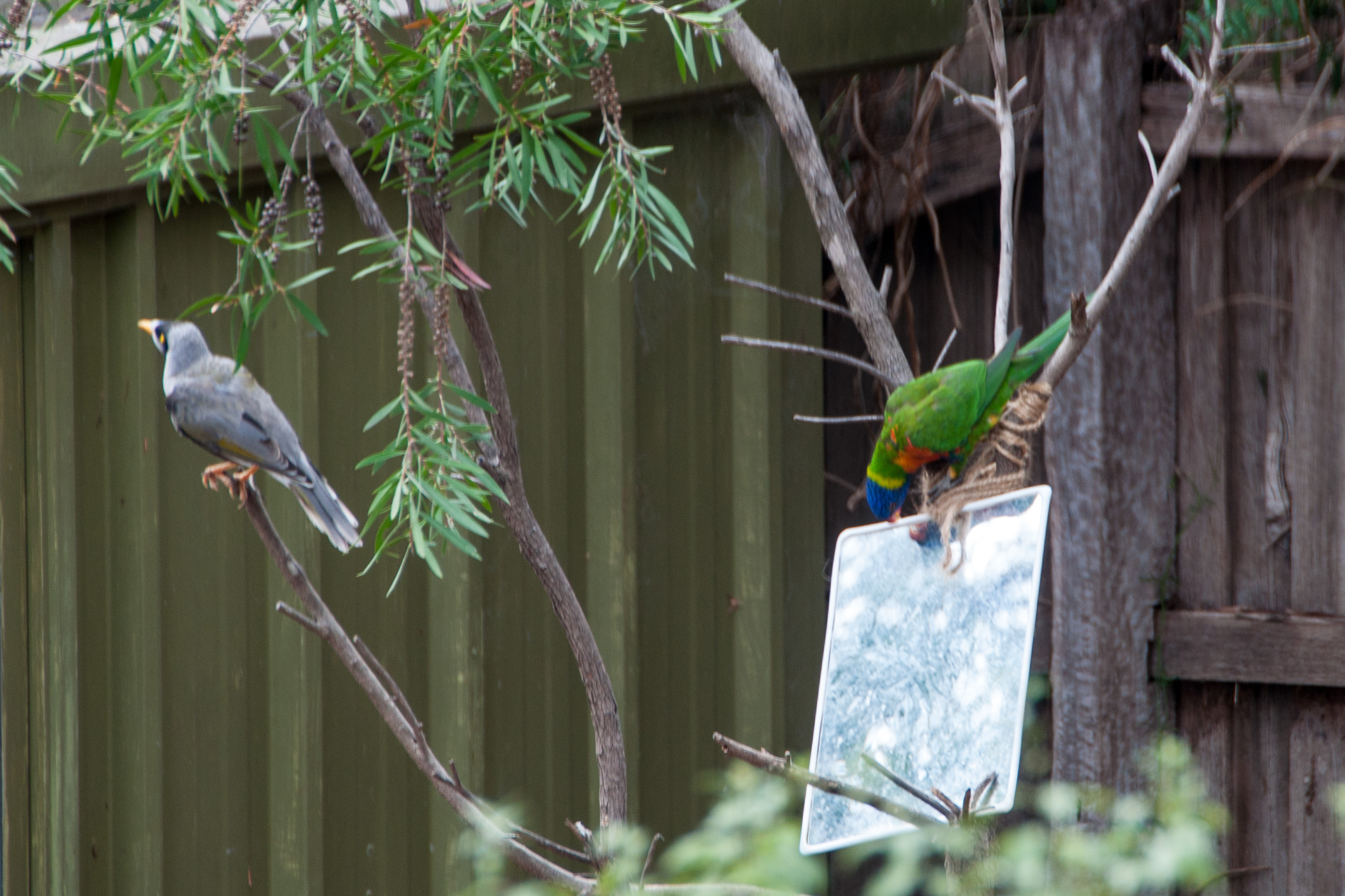 不过有时候,它们会偶尔从窗户的倒影中看到自己,傻傻地以为发现了入侵者,于是便扑到窗户玻璃上一通乱啄。为了让它们玩得尽兴,我和妻子干脆买了一面镜子挂到院子里的树上。从此那棵树就成了黑头矿鸟的宝地,几乎每时每刻都有矿鸟在那里玩耍。